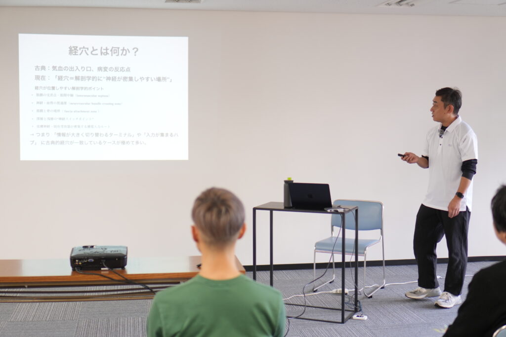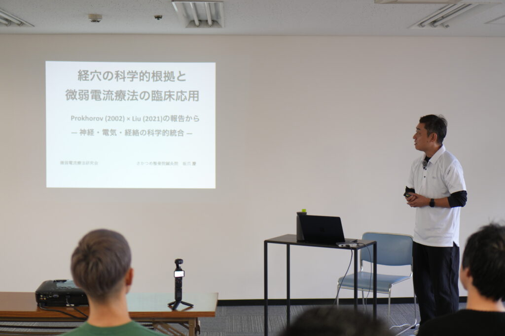 2人目の症例報告は新潟県のさかつめ鍼灸整骨院の院長、坂爪慶先生より、経穴の科学的根拠と微弱電流療法の臨床応用についてご紹介いただきました。