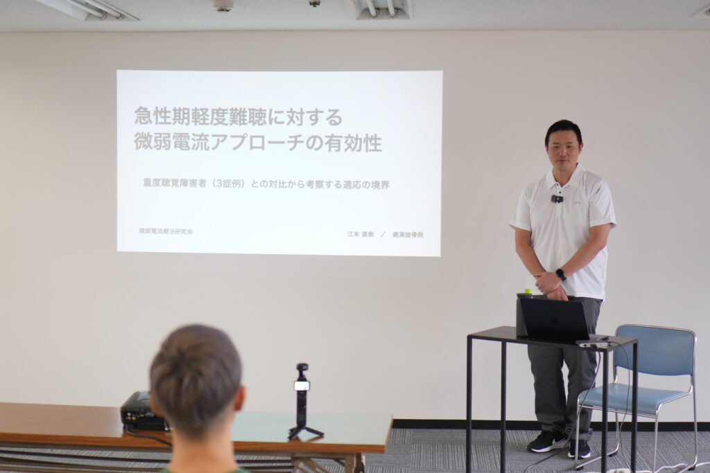 1人目は神奈川県健湧接骨院の院長、江本直樹先生より、急性期軽度難聴に対する微弱電流アプローチの有効性についての症例報告をいただきました。