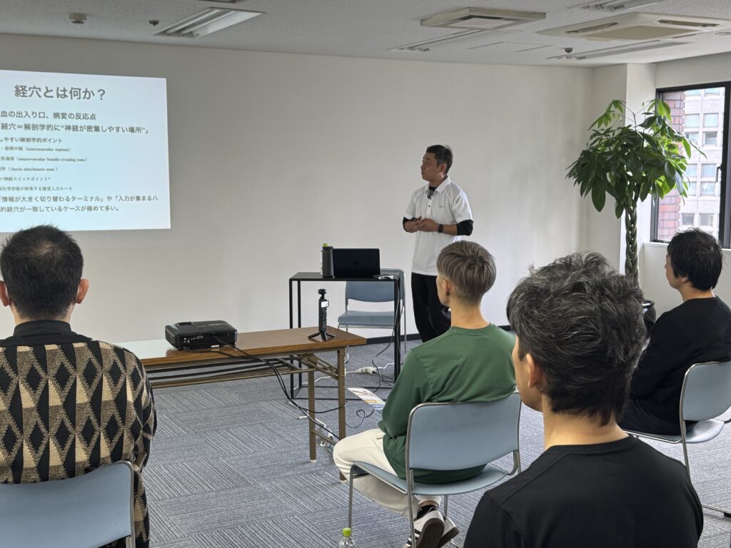 最後は、当協会の理事、フジイ整骨院院長の藤井敦志先生から、あるポイントに数箇所だけ通電するだけで体が整う、当協会オリジナルの微弱電流を用いた整体法を共有させていただきました。