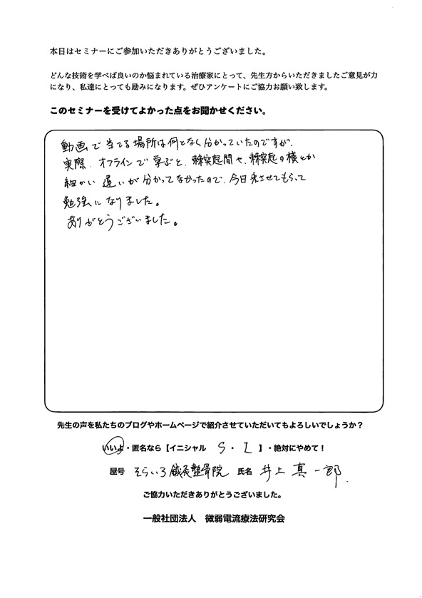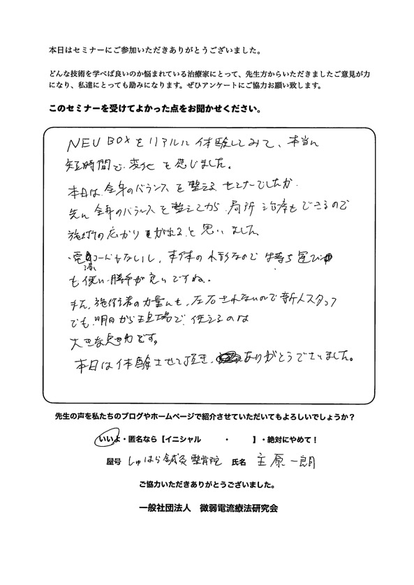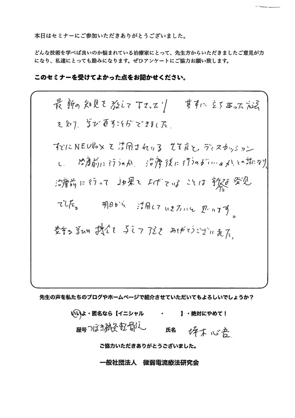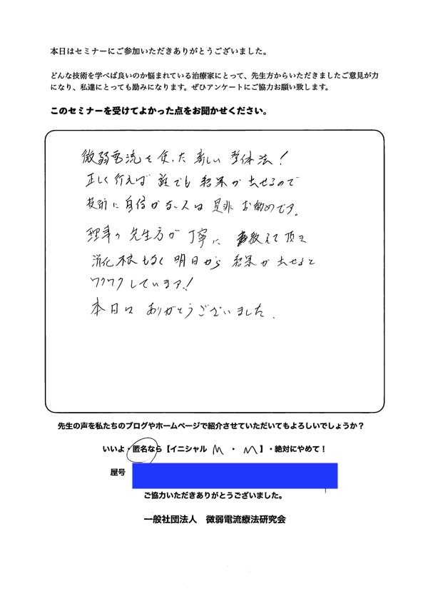 微弱電流を用いた治療体験会に参加された、柔道整復師や鍼灸師、あん摩マッサージ指圧師の先生の生の声をご紹介させていただきます。