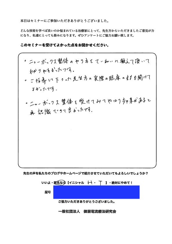 ・ニューボックス整体のやり方を丁寧に教えて頂いてわかりやすかったです。